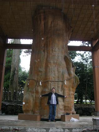 平成3年の台風19号で倒れた樹齢2千年の杉と一緒に。