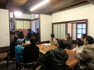 床の間。床柱はクリ古材。引き戸は古建具を再生。